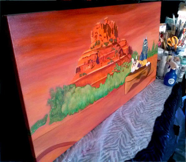 So, back to the drawing board (painting easel) today. I tried the color glaze. It just didn't cut it. So, I took bold action and painted the sky the same colors as the rest of the painting, Sedona red-orange. I have to admit that I like it! It feels much more like my style. I was apprehensive in painting this work. I guess I was more nervous than I realized, trying to paint what I thought she would like. I wanted Bell Rock to look like Bell Rock. I wanted her cats to look like her cats. I guess I went a little too far in that direction.